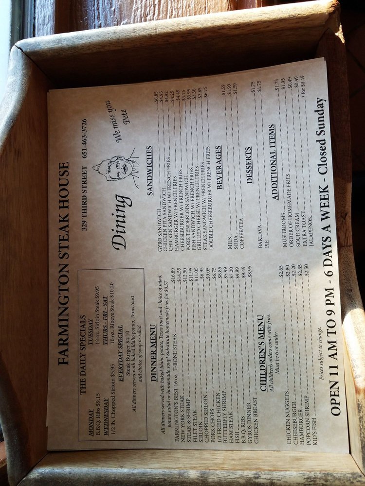 Farmington Steak House, an American steakhouse located in Farmington, MN, offers a unique cafeteria-style dining experience. Customers rave about the delicious barbecue dishes, friendly staff, and affordable prices. While the decor may be outdated, it adds to the charm of the place. The restaurant only accepts cash, which may be a consideration for some. Despite the unconventional payment method, customers keep coming back for the tasty food and welcoming atmosphere. The family-run establishment prides itself on providing a wholesome dining experience with generous portions. If you're looking for a hidden gem in Farmington with great value and a nostalgic feel, Farmington Steak House is the place to be. They offer a wide range of options for lunch and dinner, making it a perfect spot for families and groups.